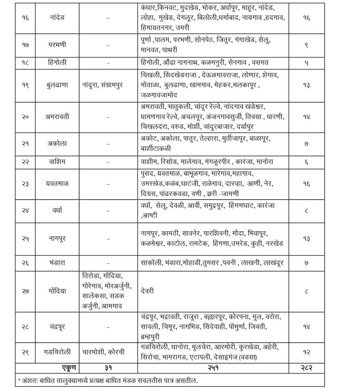 यादीतील तालुक्यांचे वर्गीकरण ‘पूर्णतः बाधित’ (251 तालुके) आणि ‘अंशता बाधित’ (31 तालुके) अशा दोन प्रकारांमध्ये करण्यात आले आहे. अनेक जिल्ह्यांमध्ये यादीत बदल करण्यात आले असून, नांदेड जिल्ह्यातील 16 च्या 16 तालुक्यांचा ‘पूर्णतः बाधित’ मध्ये समावेश करण्यात आला आहे, ज्यामुळे येथील शेतकऱ्यांचा संभ्रम दूर झाला आहे.