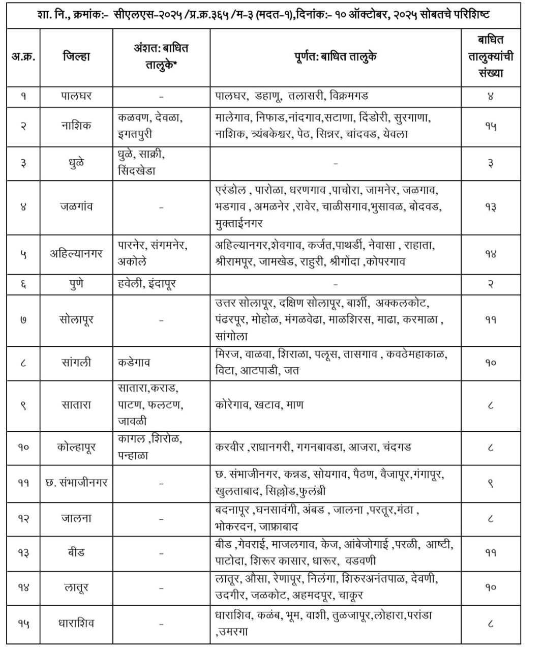 महाराष्ट्र शासनाने जून ते सप्टेंबर 2025 या कालावधीत अतिवृष्टी आणि पूर परिस्थितीमुळे बाधित झालेल्या शेतकऱ्यांसाठी जाहीर केलेल्या विशेष पॅकेजसंदर्भात अखेर एक नवीन शासन निर्णय (GR) जारी केला आहे. यापूर्वी 9 ऑक्टोबर 2025 रोजी निर्गमित करण्यात आलेल्या जीआरमध्ये सुधारणा करून, आता नव्याने 29 तालुक्यांचा समावेश करण्यात आला आहे.