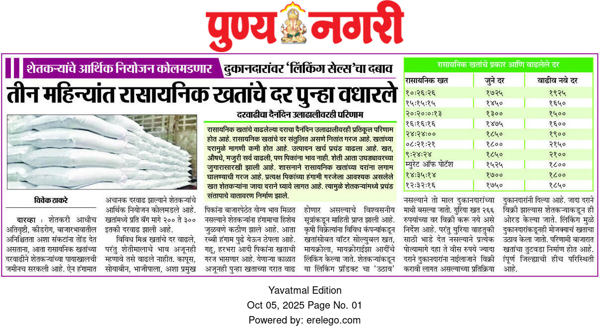 शेतकरी आधीच अतिवृष्टी, कीडरोग, बाजारभावातील अनिश्चितता अशा संकटांना तोंड देत असताना, आता रासायनिक खतांच्या दरवाढीने शेतकऱ्यांच्या पायाखालची जमीनच सरकली आहे. ऐन हंगामात अचानक दरवाढ झाल्याने शेतकऱ्यांचे आर्थिक नियोजन कोलमडले आहे. खतांमध्ये प्रति बॅग मागे २०० ते ३०० इतकी दरवाढ झाली आहे.