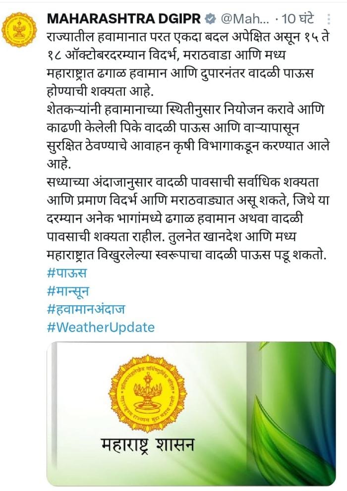 राज्यातील हवामानात परत एकदा बदल अपेक्षित असून १५ ते १८ ऑक्टोबरदरम्यान विदर्भ, मराठवाडा आणि मध्य महाराष्ट्रात ढगाळ हवामान आणि दुपारनंतर वादळी पाऊस होण्याची शक्यता आहे.